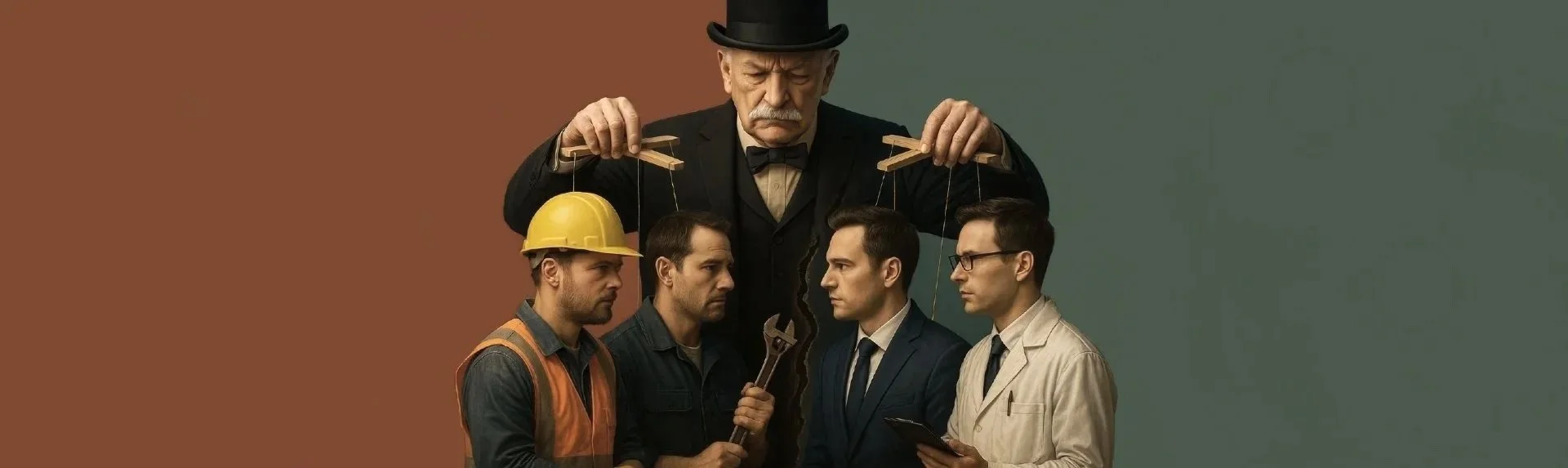Benefits flow upward. Division is the smokescreen. Offstage, power and wealth transfer: